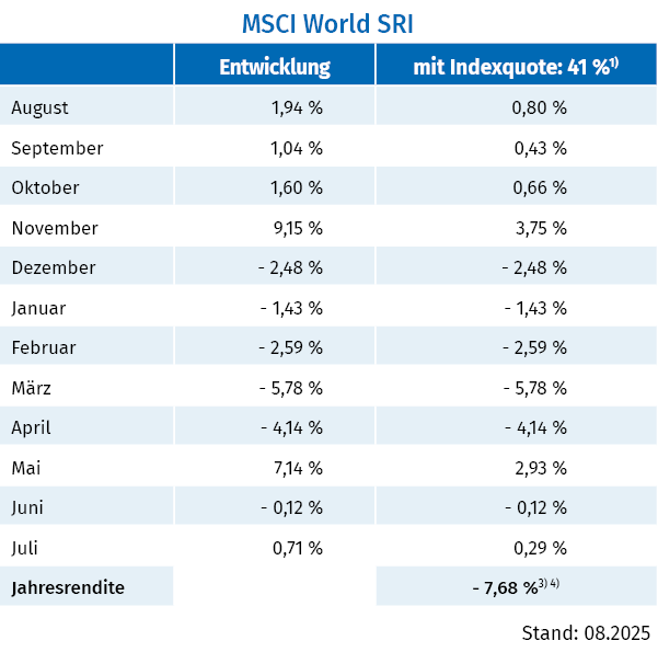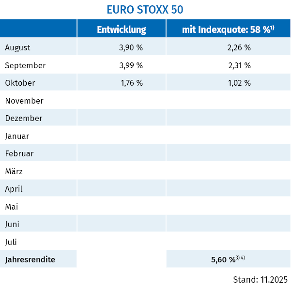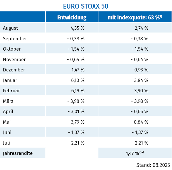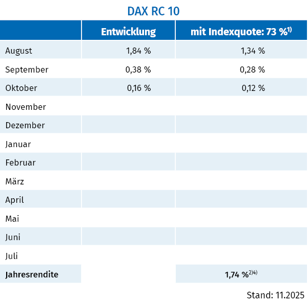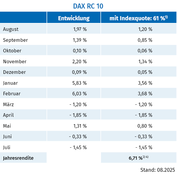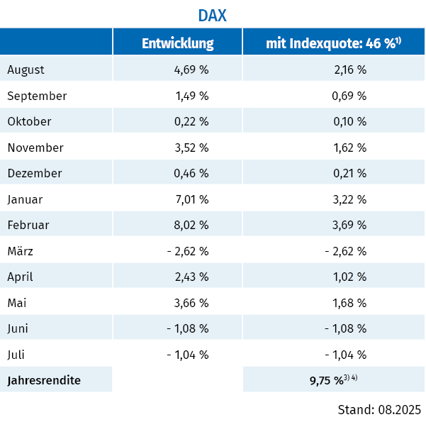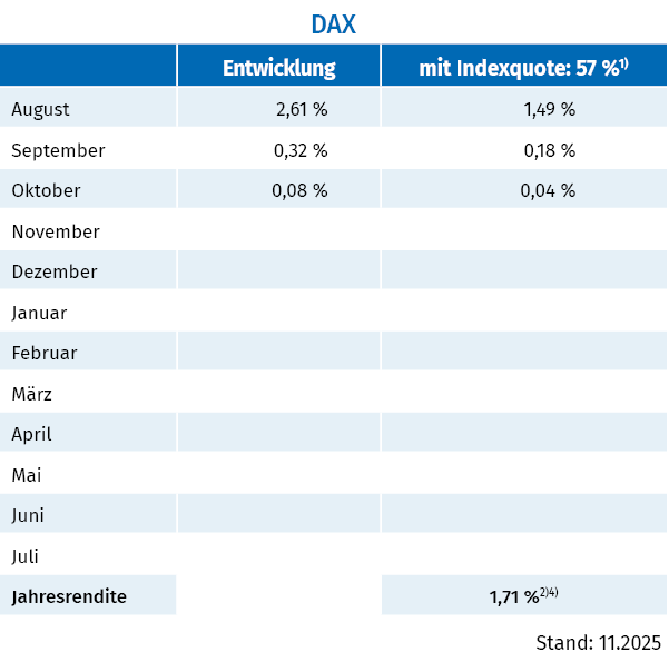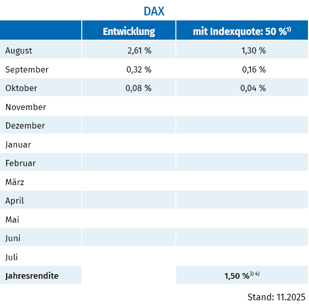 2) Diese Jahresrendite ergibt sich aus der Addition der monatlichen, mit der Indexquote gewichteten Wertentwicklungen. Ist das Ergebnis negativ, wird die Indexrendite auf 0 gesetzt.